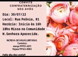 Hoje, 17º Domingo do Tempo Comum, a Igreja no mundo inteiro se une para celebrar o II Jornada Mundial dos Avós e dos Idosos, com o tema “Dão fruto mesmo na velhice” (Sl 92,15). Como paróquia, realizaremos uma bonita homenagem para os avós de nossas comunidades no próximo sábado (30), a partir das 16h, no salão paroquial da Comunidade Sagrada Família. Participe!