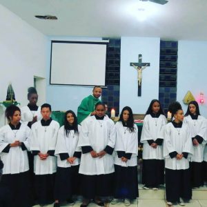Nas celebrações eucarísticas alguns jovens auxiliam o padre durante a celebração. Eles são chamados de coroinhas ou acólitos.