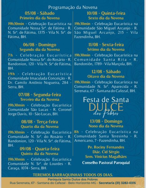 É com alegria que a Paróquia Santa Dulce dos Pobres convida fiéis e devotos para celebrarem a Novena e Festa da sua Padroeira, de 5 a 13 de agosto, no Aglomerado da Serra, em Belo Horizonte.