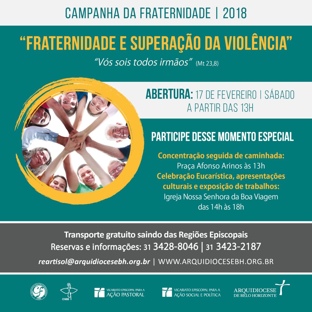 A apresentação da Campanha da Fraternidade 2018 na Arquidiocese de Belo Horizonte será realizada no dia 17 de fevereiro, sábado, no Santuário Arquidiocesano de Adoração Perpétua – Paróquia Nossa Senhora da Boa Viagem, no Bairro Boa Viagem, em Belo Horizonte. A programação começa às 13h (veja abaixo a programação completa) e haverá transporte gratuito saindo de cada uma das Regiões Episcopais da Arquidiocese. Para reservar a sua vaga, entre em contato pelos telefones 3428-8046/ 3423-2187.