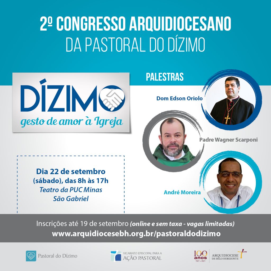 A Arquidiocese de Belo Horizonte, por meio do Vicariato Episcopal para Ação Pastoral e do Secretariado Arquidiocesano da Pastoral do Dízimo, promove o 2° Congresso Arquidiocesano da Pastoral do Dízimo, no dia 22 de setembro (sábado), das 8h às 17h.