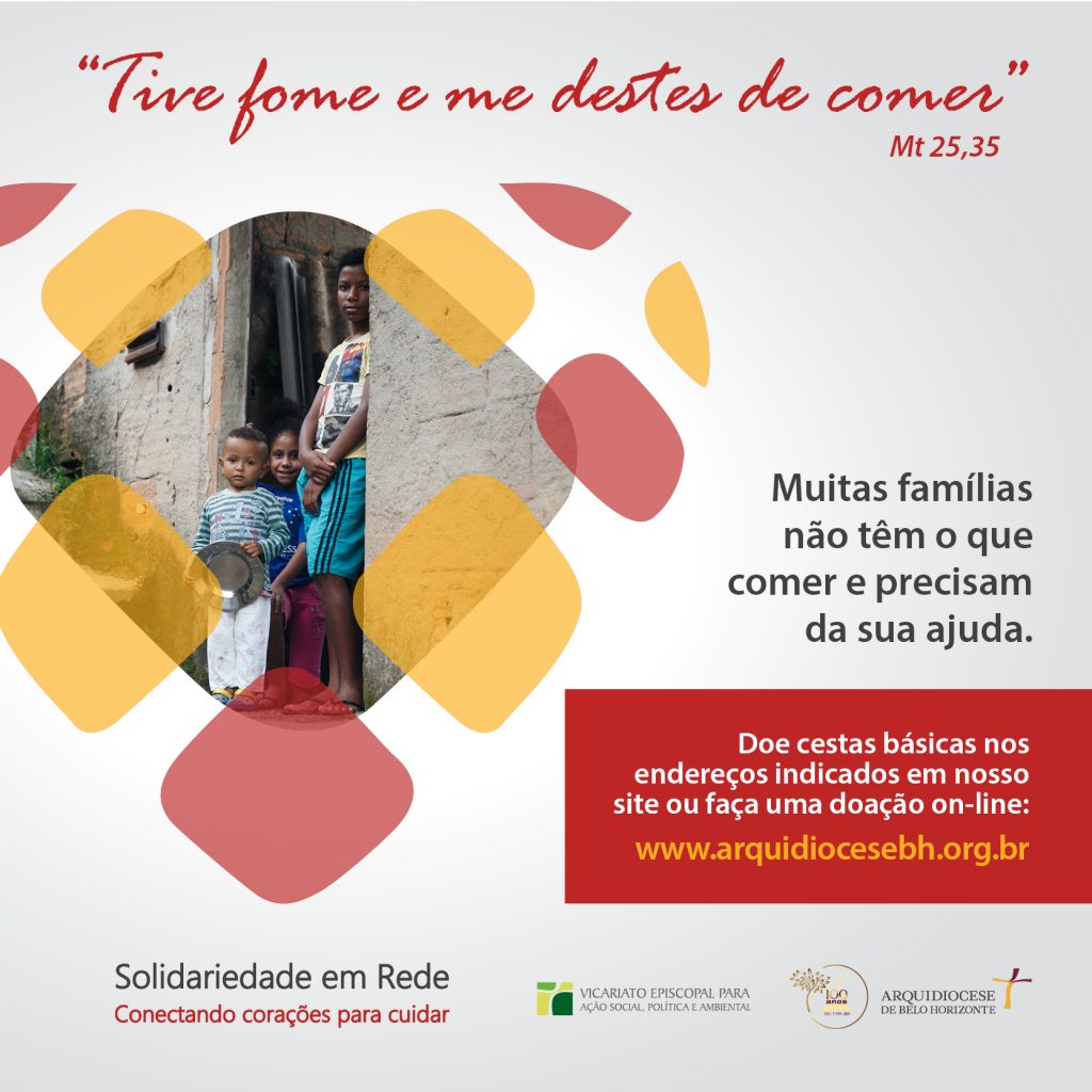 A Iniciativa Solidariedade em Rede, da Arquidiocese de Belo Horizonte, a partir de sua rede de comunidades de fé e instituições, busca levar alimentos às muitas famílias que sofrem com a fome. Para isso, pede a ajuda de quem pode contribuir com doações. De acordo com o padre Júlio Amaral, vigário para Ação Social, Política e Ambiental da Arquidiocese de Belo Horizonte, o agravamento da pandemia e de seus impactos na economia, fez aumentar o número de famílias que não têm o que comer. Muitas estão recorrendo à ajuda da Igreja, a partir de suas redes e comunidades. Por isso, o Vicariato para Ação Social, Política e Ambiental da Arquidiocese organiza um mutirão. A ideia é reunir cestas básicas e destiná-las aos mais pobres, a partir da rede de solidariedade formada pelas Paróquias.
