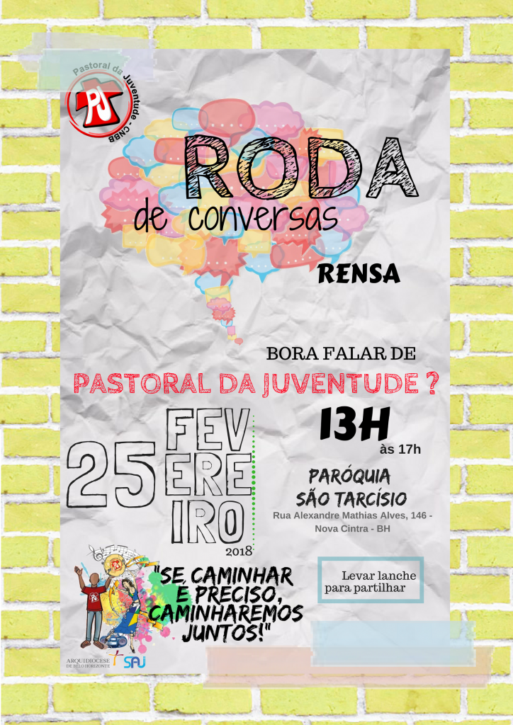 A Pastoral da Juventude (PJ) da Arquidiocese de Belo Horizonte convida os jovens das paróquias da Região Episcopal Nossa Senhora Aparecida (Rensa) para a Roda de Conversas que será realizada no próximo domingo, dia 25, de 13h às 17h, na Paróquia São Tarcísio (Rua Alexandre Mathias Alves, 146, bairro Nova Cintra, Belo Horizonte).