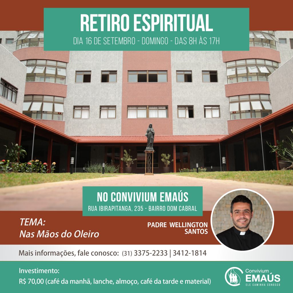 No dia 16 de setembro (domingo), das 8h às 17h, o Convivium Emaús promove Retiro Espiritual com o tema: “Nas Mãos do Oleiro”. O retiro será conduzido pelo padre Wellington Santos.