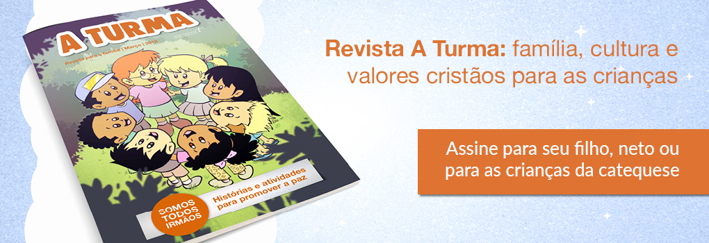 Você também pode assinar a Revista A Turma para seus filhos, sobrinhos, alunos de catequese e para toda a família. As assinaturas podem ser feitas pelo e-mail cristoreivirtual@pucminas.br, ligando para o telefone (31) 3249-7421 ou preenchendo seus dados AQUI. São cinco edições ao longo do ano.
