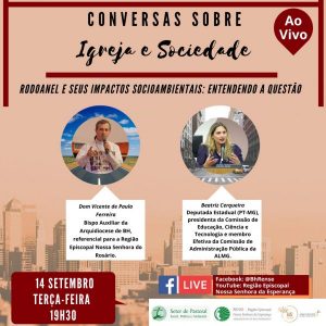 O bispo auxiliar da Arquidiocese de Belo Horizonte dom Vicente Ferreira, referencial da Região Episcopal Nossa Senhora do Rosário (Renser), participa da Live Conversas sobre Igreja e Sociedade, com o tema “Rodoanel e seus impactos socioambientais: entendendo a questão”, nesta terça-feira, 14 de setembro, às 19h30. Promovido pelo Setor Social, Político e Ambiental da Região Episcopal Nossa Senhora da Esperança (Rense), o evento tem o objetivo de refletir sobre a construção do Rodoanel, grande obra de infraestrutura viária na Região Metropolitana de Belo Horizonte. Também participa da live a deputada estadual Beatriz Cerqueira.