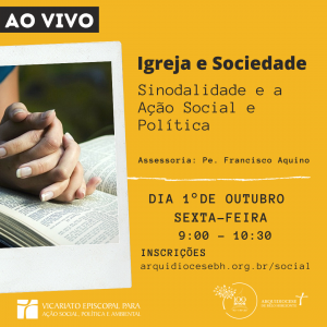 O Vicariato Episcopal para a Ação Social, Política e Ambiental promove formação online cujo tema será “Igreja e sociedade: Sinodalidade a ação social e política” no dia 1° de outubro das 09hs às 10:30h.
