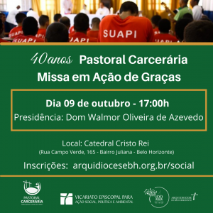 O Vicariato Episcopal para Ação Social, Política e Ambiental, por meio da Pastoral Carcerária, convida para missa em ação de graças pelos seus 40 anos de trabalho em nossa Arquidiocese de Belo Horizonte. A Celebração será presidida pelo arcebispo metropolitano Dom Walmor de Oliveira Azevedo na Catedral Metropolitana Cristo Rei (Av. Cristiano Machado, 11910 – Juliana, Belo Horizonte – MG, 31775-630) no dia 09 de outubro às 17:00 horas.