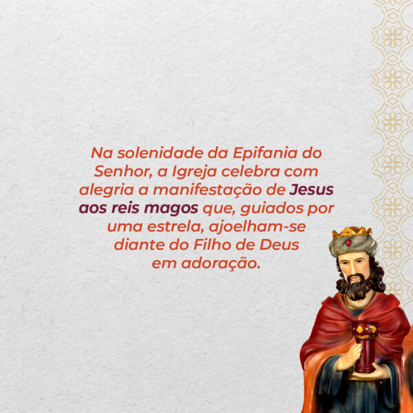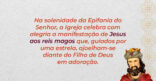 A Solenidade da Epifania do Senhor é celebrada pela Igreja Católica neste domingo, dia 7 de janeiro, data especial em que o Menino Jesus foi apresentado para o mundo e recebeu a visita de três Reis Magos: Melchior, Gaspar e Baltazar. A palavra “epifania” significa “manifestação”, é Deus que se manifesta ao mundo, é a celebração do Senhor para todos os povos. Na segunda-feira, 8 , após a Epifania é celebrado o Batismo de Jesus. Encerra-se assim o ciclo do Natal.